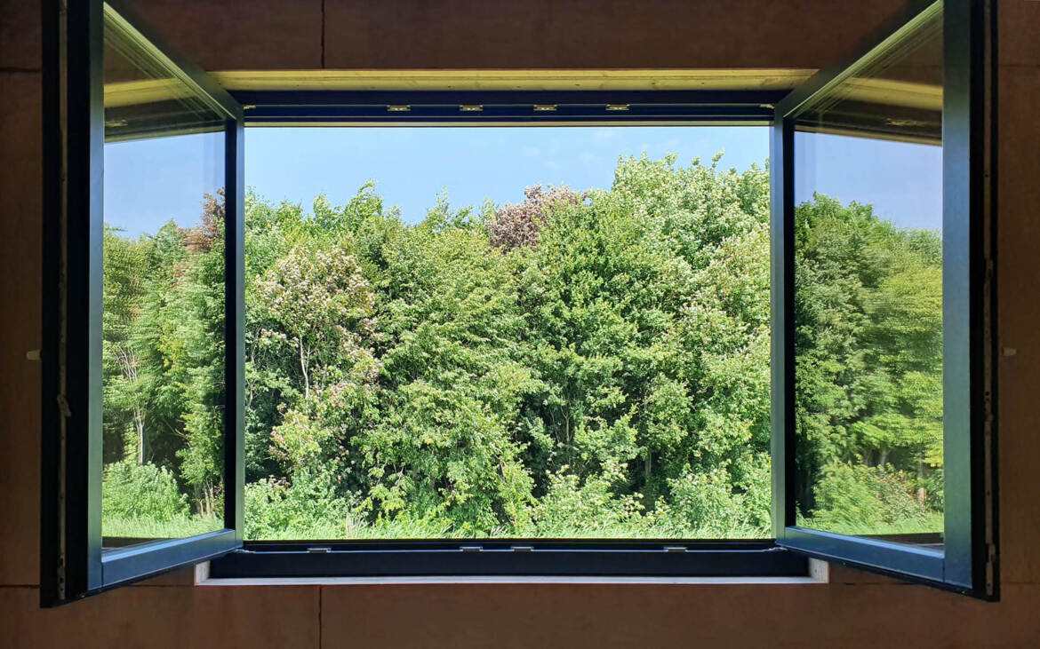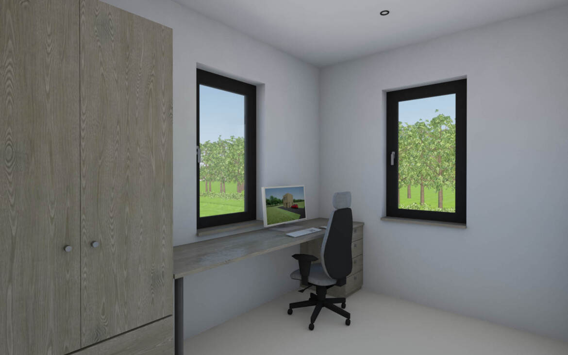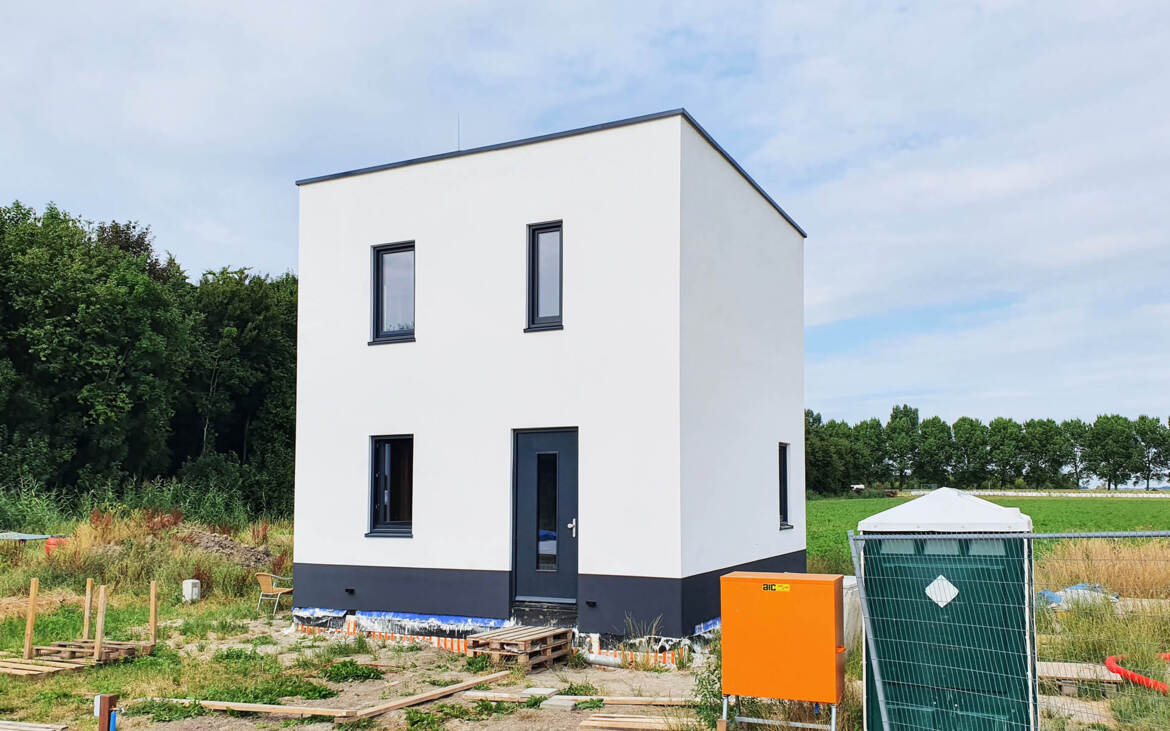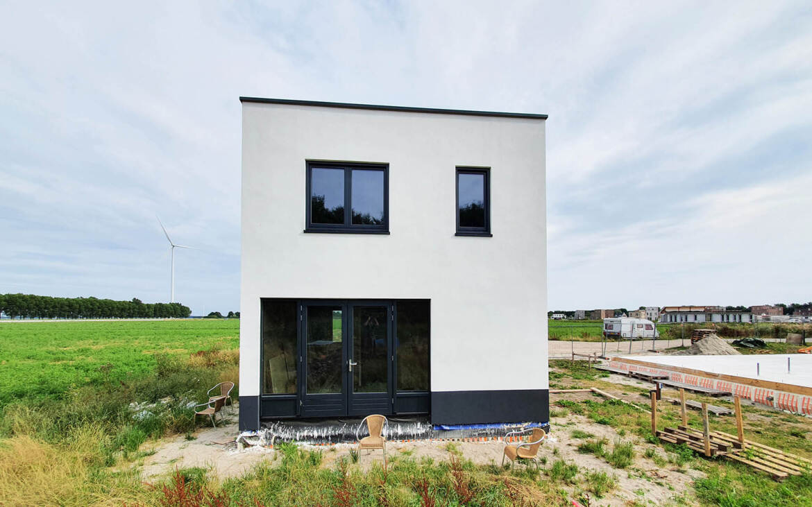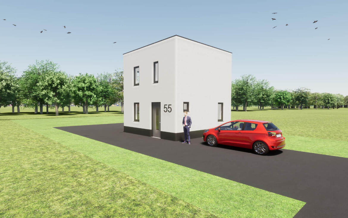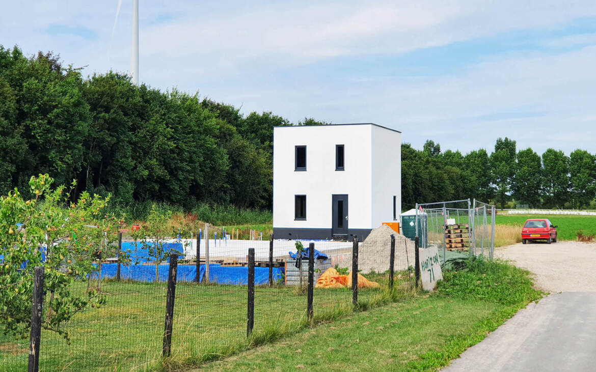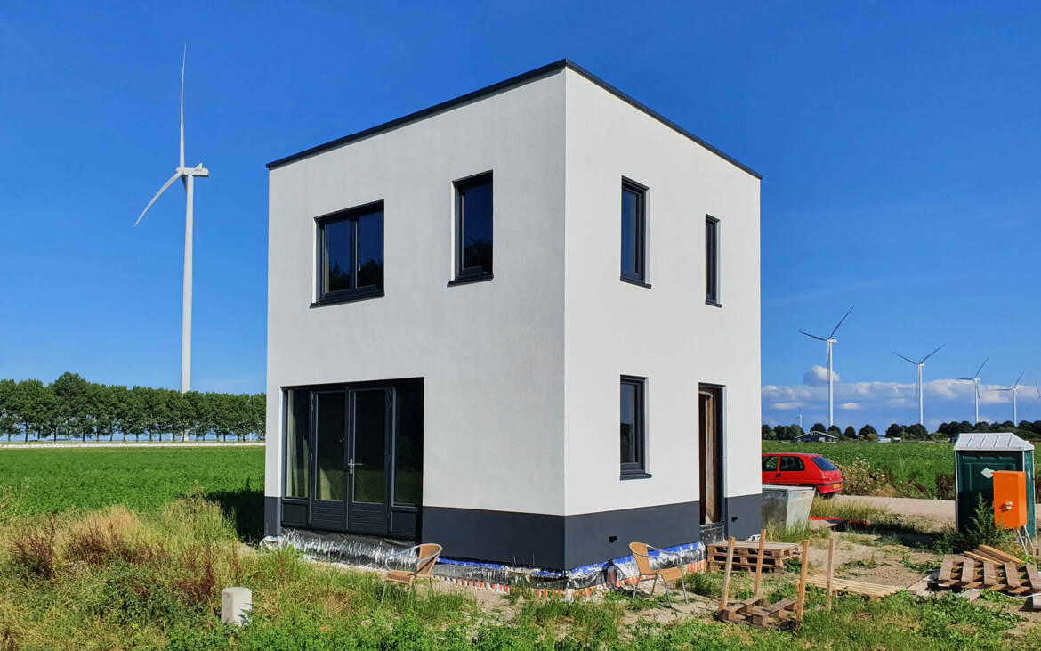 Op een royale kavel in Oosterwold Almere is een compacte, energiezuinige en betaalbare eengezinswoning gerealiseerd. Het vrijstaande woonhuis is duurzaam gebouwd, gericht op eenvoud en als groeiwoning op toekomstige uitbreidbaarheid voorbereid. De indeling van het huis is efficient en praktisch georganiseerd waarmee de leefruimte maximaal kan worden benut. Om binnen de schil van het huis zoveel mogelijk gebruiksoppervlakte te behouden is gekozen om de buitenwanden compact uit te voeren met een houtskelet opbouw en een afwerking van stucwerk aan de buitenzijde. Eisen vanuit de locatie met betrekking tot de slagschaduw van een naastgelegen windmolenpark en geluidseisen van een nabije gelegen snelweg zorgen voor een nagenoeg gesloten gevel aan de zuid- en oostzijde. Gelegen aan een bosrand heeft men vanuit de woonkamer en bovengeleven slaapkamers fraai zicht op het achtergelegen bos.