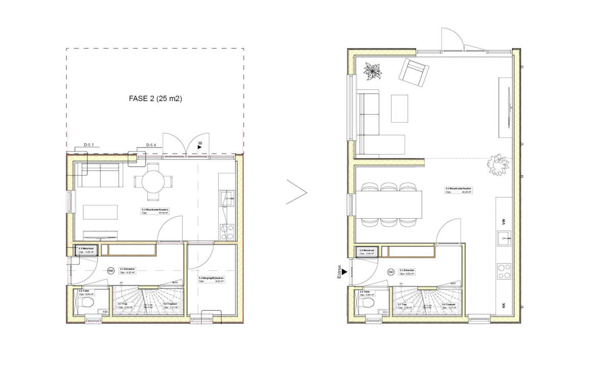 De plattegrond en installaties in de woning zijn voorbereid op uitbreidbaarheid. Fasering in het plan biedt de mogelijkheid voor een stapsgewijze investering en om te kunnen anticiperen op mogelijke toekomstige veranderingen. In de uitvoering van het woonhuis zijn de funderingspalen voor de uitbreiding al meegenomen. Over de totale breedte van het huis kan de oppervlakte van de woonkamer in een latere fase vergunningsvrij worden verdubbeld.