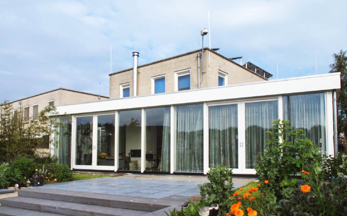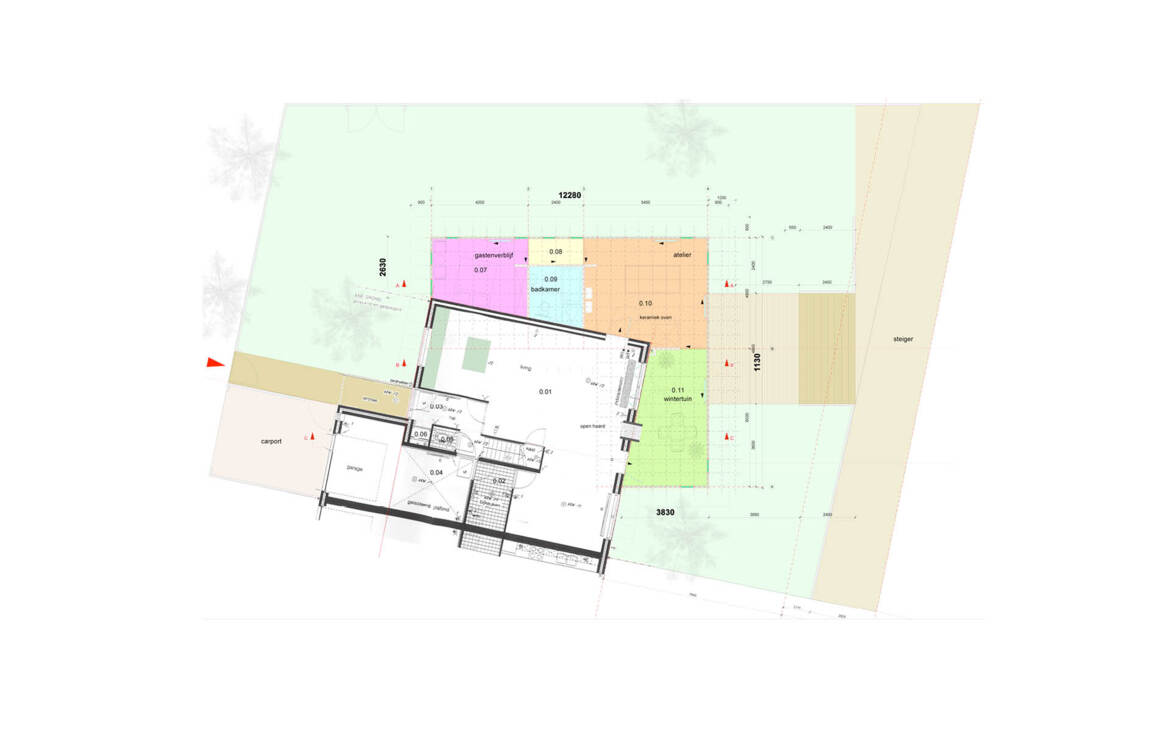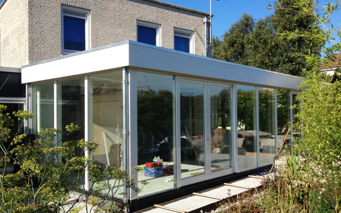 Aan een hoekwoning met grote tuin aan het water is een serre toegevoegd waarin ruimte is gecreëerd voor het atelier en oven van de pottenbakker en een gastenverblijf. De hoekverdraaiing van de uitbouw ten opzichte van het bestaande volume zorgt voor een weids uitzicht over de tuin en het water aan de achterzijde.