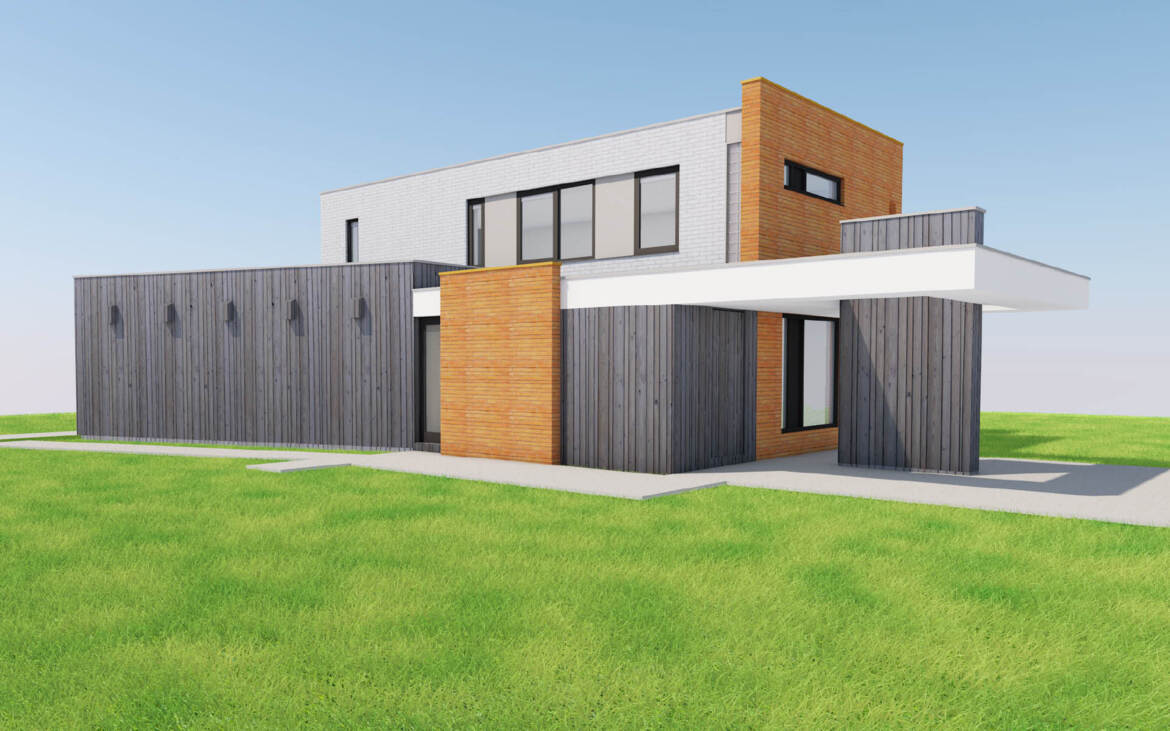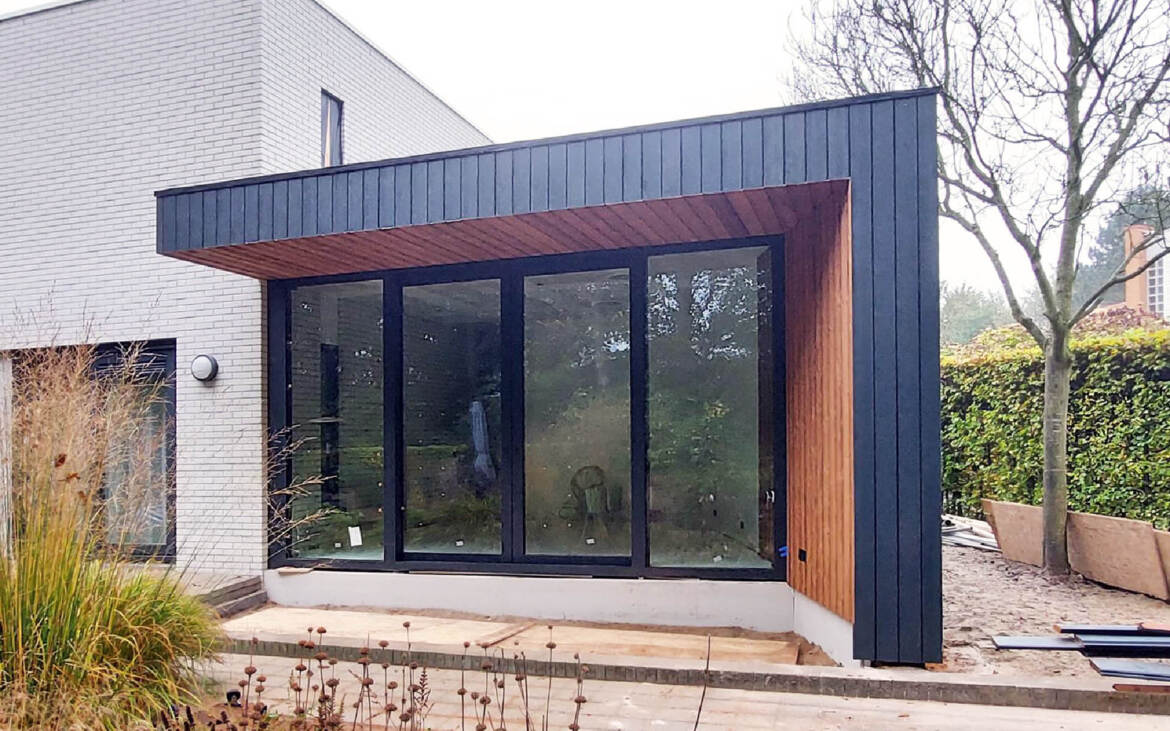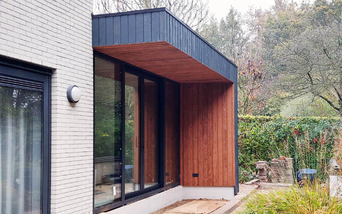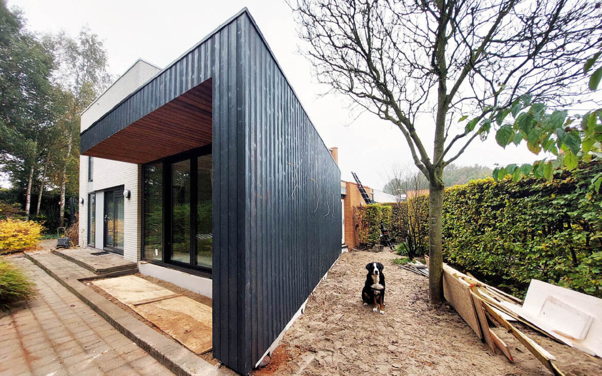 Voor deze moderne villa in Almere is een passende en eigentijdse uitbreiding ontworpen. De aanbouw bevat een atelier aan de tuinzijde, berging en entreeluifel. De uitbreiding wordt gebouwd met natuurlijke materialen en krijgt een groendak. De houten lariks gevelplanken worden door middel van een zwarte levende biologische beschermlaag verduurzaamd.