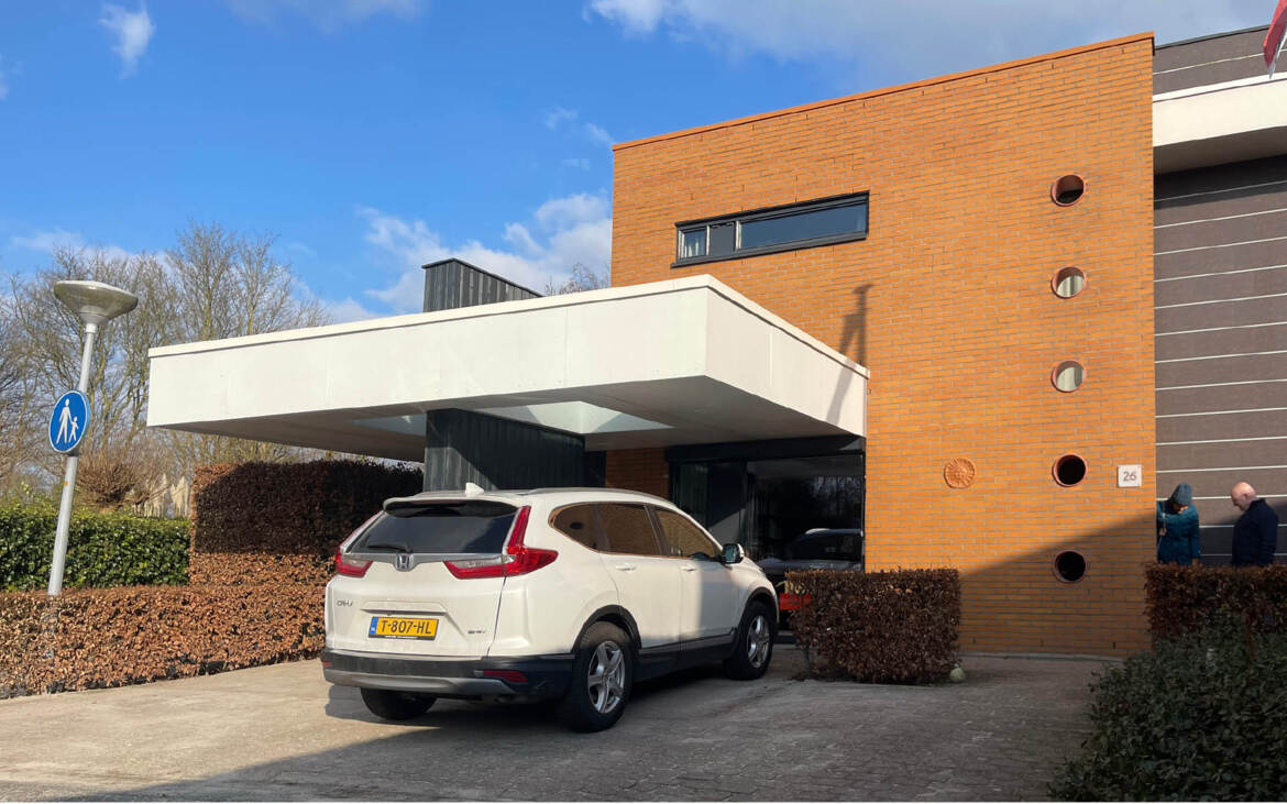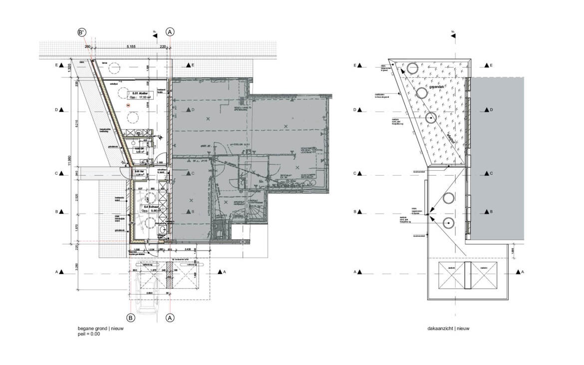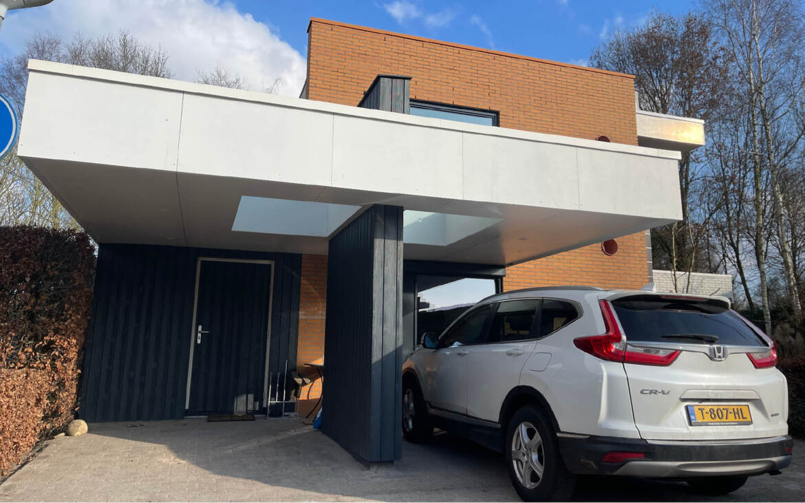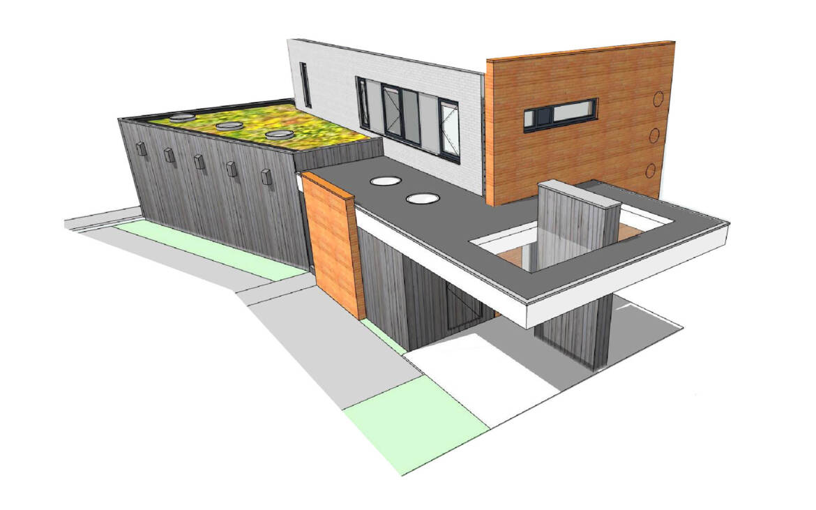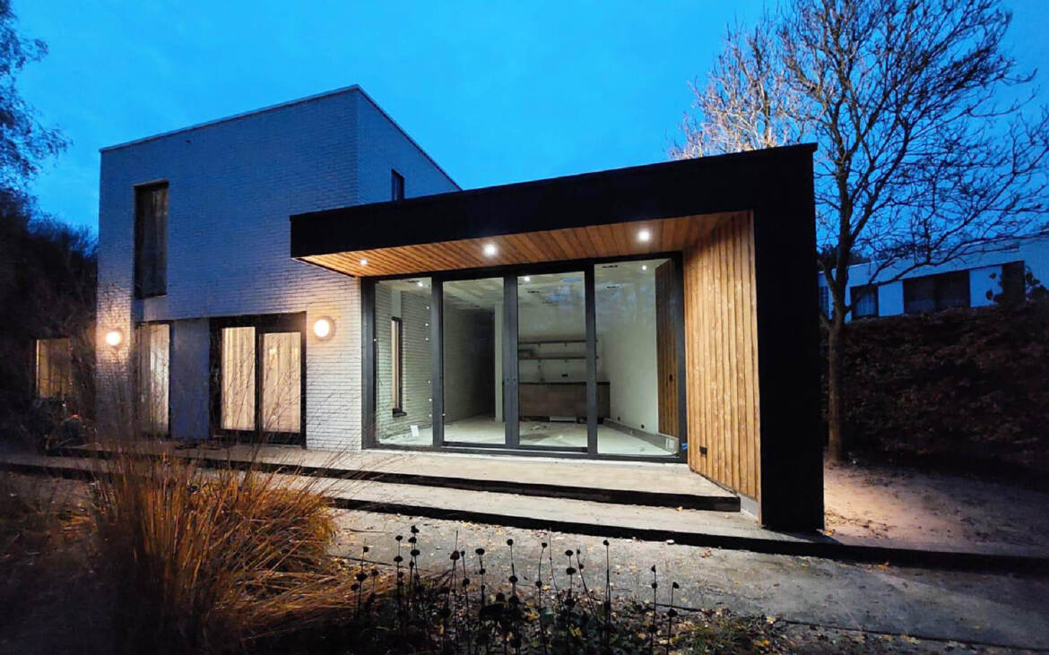 Voor deze moderne villa in Almere is een passende en eigentijdse uitbreiding ontworpen. De aanbouw bevat een atelier aan de tuinzijde, berging en entreeluifel. De uitbreiding wordt gebouwd met natuurlijke materialen en krijgt een groendak. De houten lariks gevelplanken worden door middel van een zwarte levende biologische beschermlaag verduurzaamd.