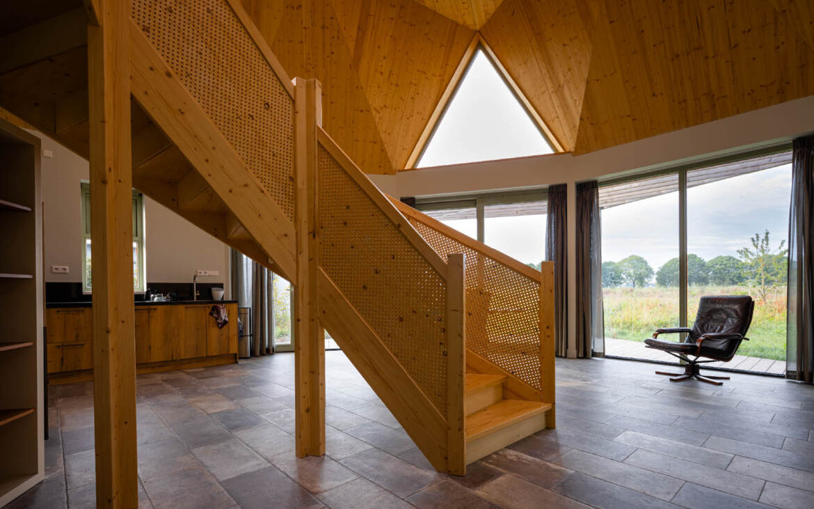 Een houten wenteltrap staat centraal in de woonkamer met dubbele hoogte waar het licht van boven door een rond dakraam naar beneden valt. Op de verdieping worden de verschillende ruimte via een galerij ontsloten. Deze opzet geeft een unieke ruimtelijke beleving met verschillende zichtlijnen op de omgeving en op de luchten van de Flevopolder.