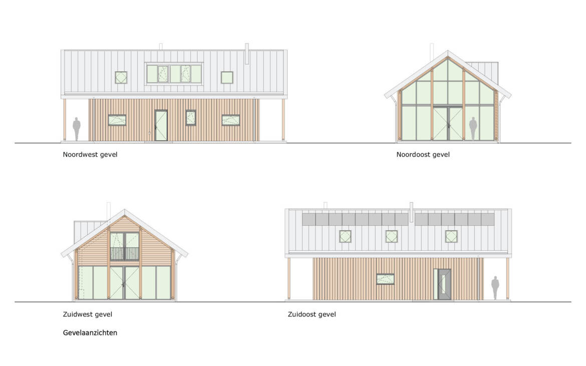 - Het woonhuis is aan de buitenzijde afgewerkt met een houten gevelbetimmering en industriele dakbekleding.